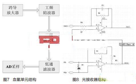 血氧探头中的光接收器是由光电池完成的,光电池可以有效的把接收到的光信号转化为电流信号。将转换的电流通过跨导放大器将电流信号转化成电压信号,需要采用低噪放大器。反馈电阻和反馈电容的值的大小需要根据发光二极管的内阻和内电容来确定。将放大之后的信号含有1V左右的直流信号和30MV左右的交流信号,将信号通过ADC转换器输入系统,并经过数字直流跟随滤波器提取直流分量输入系统。电路图如图8所示。