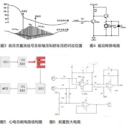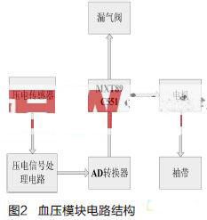 采用电机转动对袖带进行加压来阻断动脉血,通过匀速漏气阀漏气。当袖带的气压逐渐减小时,动脉血流逐渐增加,脉搏波逐渐增大,当袖带内的压力等于收缩压的时候,开始产生第一声柯式音,当袖带内的压力继续减小时脉搏波的振幅会减小直到消失,产生最后一声柯式音。将袖带连接的压力传感器MPS2107产生的差分信号通过高通放大滤波器,将脉搏波信号进行放大滤波后,通过AD采样将信号采进系统。求出脉波信号的包络线,算出峰峰值最大的点对应的气压值,按照多权值示波法原理再进一步计算舒张压和收缩压。电路结构如图2。