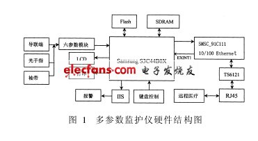 医用监护仪具有以下几个方面功能:测量功能、分析功能、报警功能、打印功能、网络通信功能等。六参数模块通过导联端、光手指、袖带获得人体的心电、无创血压、血氧、脉率、呼吸、体温六参数信号,通过串口通信方式与以ARM7为内核的嵌入式处理器相连,数据从串口送到ARM7中 央处理器,通过多任务调度,进行实时数据处理,并在LCD上实时显示各种信号的图形和数值,还可以由外部键盘控制,进行存储和网络发送,并对各种检测信号设置报警线,对超出报警范围的检测情况进行报警。硬件结构图1所示。