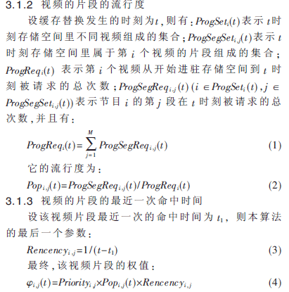 分段方法的讨论集中在如何将大容量的流媒体对象划分成合适的片段,提高网络传输的效率,前缀缓存算法[2]有效减小了客户端启动延时;批处理补丁结合前缀缓存思想重点在于提高命中率,减少用户的等待时间;在此基础上提出的最优批处理补丁预先缓存算法[3](BPP)通过补丁的预先缓存,减少了用户的等待时间,节省了主干网络的带宽;指数增长的分段(Exponential Segmentation)策略[4]能够快速替换片段来适应缓存对象的访问模式的变化;基于自适应和滞后[5](Adaptive and Lazy)的分段方法根据用户对于不同的流媒体对象的访问频率和访问长度来自适应地改变分段长度和选取删除段。SCU算法[6]旨在提高缓存的前缀字节命中率,减少访问延迟,降低流媒体播放时的网络传输成本。