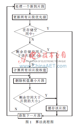 给此三类视频节目赋予不同的优先级Priorityi,对应某类视频的片段优先级表示为Priorityi,j。热门视频的优先级最高,其次是经典视频,冷僻视频的优先级最低。需要强调的一点是,上述三种视频之间没有绝对的界限,根据对节点储存空间内的视频进行记录统计,它们之间存在着互相转化的可能。例如,热门视频会逐渐变成经典视频或冷僻视频,冷僻视频也有转化成热门视频的可能性。因此,本算法不仅仅是简单利用优先级Priorityi,j,而是每隔时间T对存储空间里所有片段的优先级进行更新(T值通过试验来确定)。