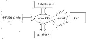整个监控系统主要是由ARM、GPRS DTU、USB摄像头和PC组成。ARM开发板以Linux操作系统编写驱动,通过指令调度利用USB摄像头进行图像采集,将采集好的图像通过GPRS DTU进行无线传输,PC与因特网相连接,接收到GPRS DTU传输过来的图像,通过VC++编写上位机,可以看到监控点传输的图像。操作人员可以通过短信或电话对监控端进行控制,可以使监控端随时处于工作或关闭状态,这样一来不仅可以随意对监控端进行控制还可以节省流量,经济实惠,特别适用于一些对动态图像要求不高的环境,系统结构框图如图1所示。
