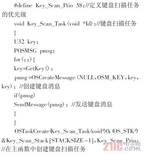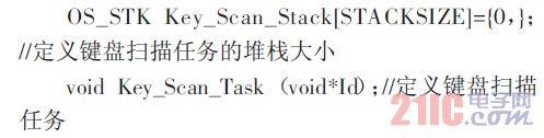 μC/OS-Ⅱ操作系统上允许同时运行64 个任务,其中8 个任务被系统的内核使用。要想在应用程序中建立一个新的任务,必须先为任务定义自己的栈空间,选定一个系统唯一的任务优先级。下面以键盘扫描任务为例,具体程序见程序清单4.1。