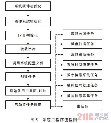 为了充分发挥操作系统在任务调度、任务管理、任务通信、时间管理和内存管理等方面的优势,首先必须根据需要实现的功能,合理地划分任务和分配任务的优先级。任务优先级的确定原则是工作频率越高,任务的优先级越高。系统中并行存在7 个应用任务,按优先级从高到低依次是模拟信号采集任务、模拟信号处理任务、数字信号采集任务、系统时间修正任务、液晶刷新任务、键盘扫描任务、液晶自动关闭任务。任务之间的通信是通过发送或接收消息、信号量或数据队列来实现的。