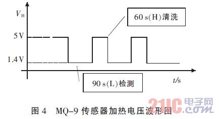 对于图3 中的加热电压VH,MQ-135 采用5 V直流电压作为加热电压;MQ-9 采用5 V 高电压、1.4V 低电压循环加热的方式。对于MQ-9,当VH=5V 时,清洗传感器;VH=1.4 V 时,传感器工作,可以采集气体浓度,其中,高电平持续时间为60 s,低电平持续时间为90 s。MQ-9 加热电压波形如图4 所示。
