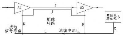 ②去除M:环路消失,但是我们发现,此时放大器A2的地线电流需要流过J、N到达接地零点,注意N段是A1和A2共同的接地线,因此A2接地电流在N上形成的电压降就加到了A1上,形成干扰。这种因共用一段地线而形成的干扰称为“公共阻抗干扰”。