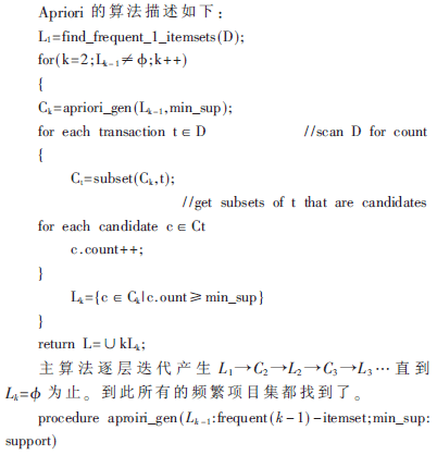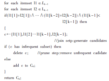 代码中apriori_gen( )函数[3]主要完成两个动作:连接和剪枝运算。Lk-1与Lk-1进行连接生成候选频繁项集。然后剪枝部分利用Apriori的性质删除掉包含非频繁子集的候选。