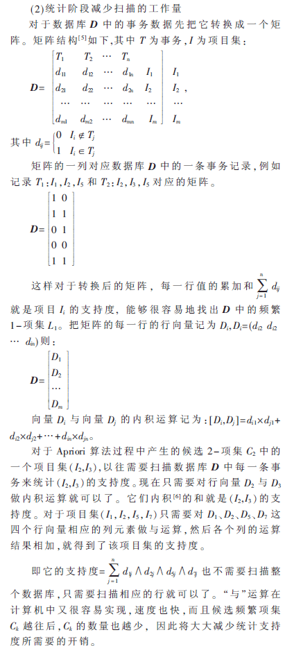 新的算法从三个方面对原有的算法进行了改进,减少了产生的候选频繁项集Ck中项集的数据,也减少了剪枝过程中的运算次数,在统计支持度阶段减少了需要扫描的数据库中的事务数。而且计算机进行向量运算和位运算速度更快,程序也会更容易实现。实验证明,新算法在系统的开销和时间效率上都有很大的提高。