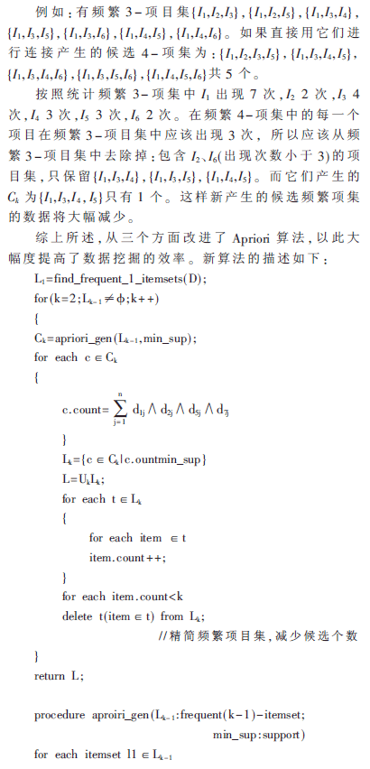 根据频繁项集的性质[7],当要用Lk-1连接产生Ck时,首先统计Lk-1中各个项目出现的次数,如果该项目出现的次数小于k-1,则该项目所在的项目集不用来链接生成Ck[8]。