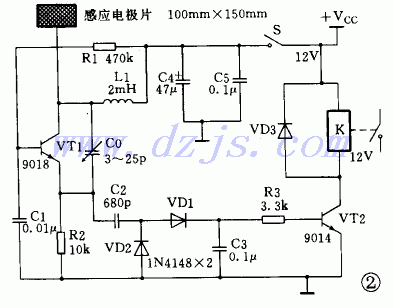 在图2中,三极管VT1与周围元件构成一个射频振荡电路;金属感应电极片连在VT1的集电极作为探测器。在没有其他导体接近感应电极片时,VT1组成的振荡电路正常振荡,此时VT1发射极输出的射频电压信号经VD1、VD2检波后成为直流控制信号,该信号使开关管VT2导通,继电器得电吸合,接通被控电路的电源:当有导体接近感应电极片时,由于任何靠近感应电极片的导体都会感应出电极片和“地”之间的电容,而电容的增加就会降低振荡器的正反馈量直至振荡器停止振荡,如果振荡器停振,射频检波电路就不再输出直流控制信号,此时开关管VT2就会截止,使继电器失电断开,而且继电器断开后需要再松开开关S再闭合后,电路才能进人下一次振荡状态,否则继电器就一直断开。