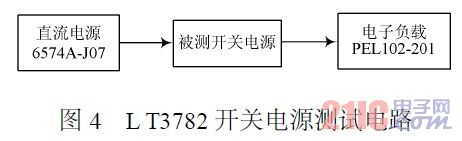 为了验证该开关电源性能,采用如图4所示的方法进行验证。因为该电源的输入电流较大,输入的直流电源采用安捷伦的6574A2J07。它的输出电流最高可达42A,输出电压在0~50V范围内可调,输出负载采用建伍的PEL1022201,通过它可以直观地看到输出电压和电流情况。经过验证,该电路完全满足使用单位需求。