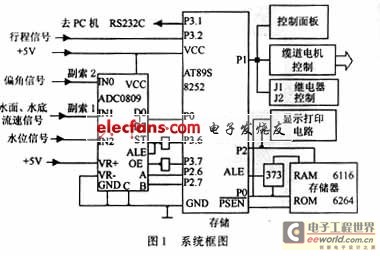 采用AT89S8252单片机。由于河道测验的数据量大且运算比较复杂,而单片机内部的存储器容量有限。故增加外部存储器RAM6116和ROM6264.外部信号的输入采集接口是以多路A/D片ADC0809为核心,将缆道信号和水位信号送到单片机P1口和P3口承担其他输入、输出信号的接口。下面根据水文测验的特点,介绍主要的接口电路和工作过程。