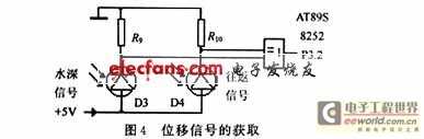 铅鱼的行程信号包括铅鱼水平往返移动的行程信号,和铅鱼测量水深时垂直移动的水深信号。位移信号的获取如图4所示。他是由加装在机械传动装置上的切光板和光电门获得。设计为缆索每移动1 cm切光板遮光一次,光电门产生一个脉冲。水深和往返信号分别从光敏二极管D3,D4上取出,经过异或门后加到单片机P3.2外部中断0输入端,每移动1 cm产生一个中断,中断服务程序可以区别铅鱼此时作水平往返移动还是垂直移动,两者只取其一。
