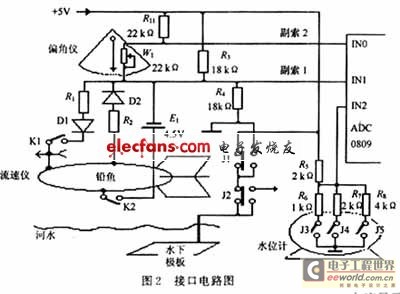 他将电传水位计的水位变化信号和缆道送来的流速、偏角、水面水底信号经变换后传送到单片机。该接口具有电路简单、稳定可靠、抗干扰强等特点。