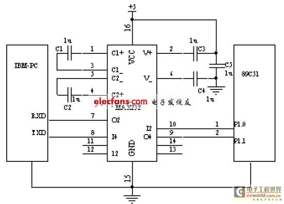 89C51 单片机通过普通I/O 口与PC 机RS232 串口实现通信的硬件接口电路如图2 所示。由于PC 系列微机串行口为RS232C 标准接口,与输入、输出均采用TTL 电平的89C51 单片机在接口规范上不一致,因此TTL电平到RS232 接口电平的转换采用MAXIM 公司的MAX232 标准RS232接口芯片,该芯片可以用单电压(+5V)实现RS232接口逻辑“1”(-3V~215V)和逻辑“0”(+3V~15V)的电平转换。图中89C51 的P1.0 模拟发送端,P1.1 模拟接收端。