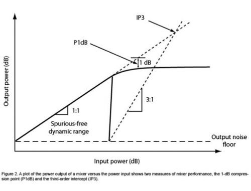 在标准或线性工作条件下,混频器的变频损耗是恒定的,与RF功率无关。这意味着,当你以1dB的幅度增加输入功率时,输出功率也会以1dB递增。在P1dB压缩点,输入功率增加,以便输出不随输入功率线性增加。这也是混频器变频损耗高出理想值1dB的原因(图2)。