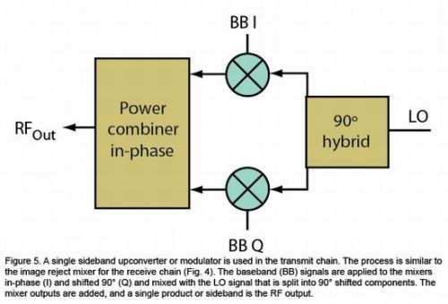 图5:单边带上变频器或调制器用于发射信号链中。此过程类似于接收信号链的镜像抑制混频器(图4)。基带(BB)信号被施加到同相(I)和90°相移(Q)混频器,并与分成90°相移分量的LO信号进行混频。增加了混频器输出,单个产物或边带为RF输出。