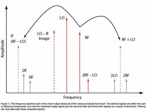 图3:混频器输出的频谱图显示产生的所有不同产物。需要的信号为和频或差频,不过请注意,有害镜像信号和二阶和三阶信号为谐波的结果。滤波有助于减少这些有害信号。
