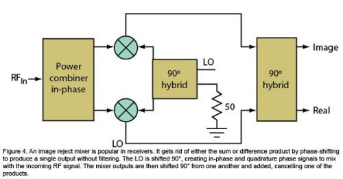 图4:镜像抑制混频器在接收器中最受欢迎。它可以通过相移去掉和频或差频产物,产生单个输出,而不需要滤波。LO进行90°相移,产生同相和正交相位信号,与输入的RF信号进行混频。然后混频器输出互相进行90°相移,从而去掉部分产物。