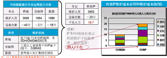 网络设备IP化后,承载采用的MPLS技术涉及到大量参数(估算是SDH的5倍以上),开通相同数量的基站、业务开通所需的人力至少要增加4-5倍。同时无线基站经常要进行网络优化,通常涉及数百个node B和RNC之间的归属关系要调整,因此IP回传网络的同步调整将非常复杂,由于参数众多,出错率很高,耗时耗力。