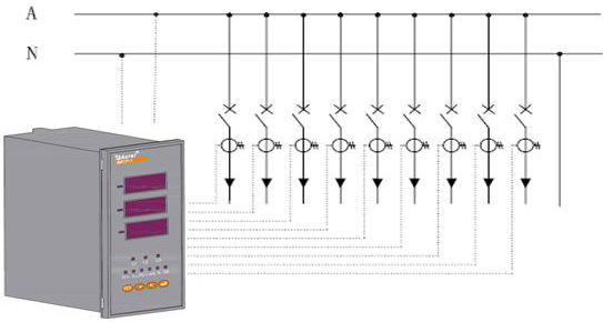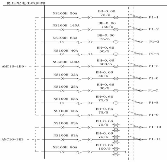 图6为AMC系列单相多回路智能监控单元的典型应用图。在应用中,出线回路中的9个单相负载的所有电参量测量都由1个AMC单相多回路监控单元来实现。并带有Modbus通讯输出,供用户远程监测和控制。