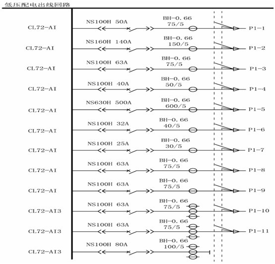 图7是江苏某广电大厦0.4kV低压配电出线图。在该设计图中,每个单相负载的电流测量采用CL72-AI(测量单相电流)表来实现,每个三相负载的电流测量由CL72-AI3来实现(测量三相电流)。由图可以看出,该出线回路总共要使用12个仪表。