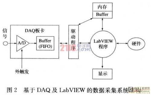 数据采集是LabVIEW的核心技术之一。也是LabVIEW与其他编程语言相比的优势所在。在设计中根据测试系统的特点采用PC-DAQ(Data AcQuisition)体系结构。数据采集部分采用NI USB-6009 DAQ,模拟信号8通道单端输入,最高采样率42kSa/s(多通道合计)。数据处理和数据显示部分在PC机中用LabVIEW 8.2实现。PC机配置为:奔腾4 CPU 2.00GHz、内存256MB、硬盘60GB。其采集系统结构图如图2所示。