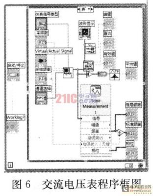 基于对交流电压表原理的分析,在设计的过程中,利用LabVEW提供的工具模块对采集的电压信号通过不同形式的检波、计算等处理分析得出交流电压信号的有效值、峰值和平均值。对于一个纯粹的交流电压,正半周期信号和负半周期信号对称,平均值等于零,所以一般我们不直接测量平均值。在设计时,按Functions>>Nu-meric>>Absolute value取交流电压的绝对值,然后求平均值,即全波平均值;交流电压中的最大值,即为峰值。可以把数据进行比较求出最大值,可通过Waveform MinMax来进行处理;用DC value测量直流分量和用RMS value测量有效值。这样即把有赖于硬件电路的测试全部由软件来实现,提高系统的性能及集成度。其设计的程序框图如图6所示。