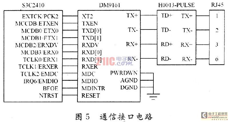 对于以太网接口,S3C24lO内嵌了两个以太网控制器,在全双工模式下支持IEEE 802.3.MAC控制层协议,但未提供物理层接口,需外接一片物理层芯片以提供以太网的接人通道。本系统中选用DM9161作为物理层芯片,由于信号定义很明确,连接比较简单。信号的发送和接收应通过网络隔离变压器和网络水晶接头RJ45接口接入以太网。DM9161是高集成度、低功耗的100Base-TX和10Base-T物理层收发芯片,只需要连接很少外围元件就可以实现以太网数据的物理层收发,提供完全IEEE 802.3u中定义的100Base-TX所有的物理层功能。使用非屏蔽双绞线(UTP5/UTP3)作为传输媒质,为MAC层设备提供MII。MII是IEEE 802.3u标准(Clause22)中定义的接口规范。其目的是提供一个简单的、易于实现的MAC子层和物理层的接口。MII接口使得不同的传输媒质和物理层接口模块可以通过统一的接口与MAC子层进行数据交互。