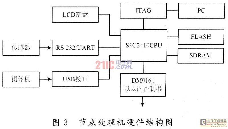 节点处理机要执行繁重的通信和算法处理,对处理器的通信和运算速度有很高的要求,传统的单片机处理器性能有限无法满足节点的要求。因此采用SAMSUNG公司的处理器S3C2410平台,它具有灵活的特性和强大的性能,在嵌入式系统中得到了广泛的应用。该处理器内部集成了ARM公司ARM920T处理器核的32位微控制器,资源丰富,带独立的16 KB的指令CACHE和16 KB数据CACHE,LCD控制器、RAM控制器、NAND闪存控制器、三路UART、四路DMA、四路带PWM的Timer、并行I/O口、八路10位ADC、TouchScreen接口、I2C接口、I2S接口、两个USB接口控制器、两路SPI,主频最高可达203 MHz。在处理器丰富资源的基础上,还进行了相关的配置和扩展,平台配置了16 MB 16位的FLASH和64 MB 32位的SDRAM。通过以太网控制器芯片DM9161扩展了一个网口,另外引出了一个HOST USB接口。硬件平台如图3所示。主要包括数据采集、数据显示、数据存储以及数据传输(网络控制)。这里主要介绍数据显示和数据传输的实现。