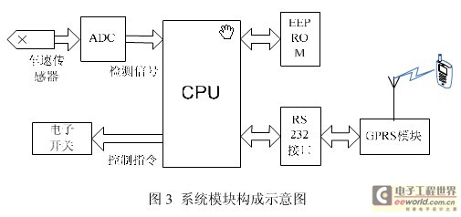 嵌入式系统设计中常用模块化设计方法,以降低开发难度,减少各个部分之间的耦合度,增强系统的稳定性。如图所示,整个系统主要由CPU,传感器,RS232 接口以及GSM 模块构成。其中CPU 是系统的核心控制部分,负责接受各模块信号,进行处理,并控制其它模块;传感器探测汽车被启动;GPRS 模块用来收发短信,向车主手机通过RS232 接口与CPU进行通信;电子开关电路用于控制汽车电路系统,能够达到对汽车断油,断电的目的。