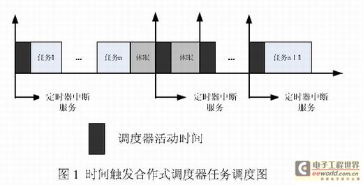 时间触发合作调度器的主要功能就是唤醒预先确定好时间执行的任务。在工作期间,调度器检查静态的任务链表,根据任务的周期判断是否有任务需要执行。如果有则立即执行任务;任务执行完后继续检查任务链表,重复上一个过程。完成链表检查后,CPU 可以进入休眠状态,等待下一个时钟节拍的到来。其任务调度机制如图1 所示。由于合作式调度器能保证在同一时刻,系统中只有一个任务被触发,而且在任何时刻系统中都可以保证有任务在执行。这样,系统的使用效率得到了提高。