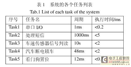 在表列出的各项任务中,Task1 每1ms 对buffer 进行查询,如果有需要收发的信息,马上通过串口收发。串口收到的string 流存放到缓冲区中,交给Task2 进行处理。Task2 周期为1s,负责PUD 短信的编解码,对命令的识别和控制信号的发送,它是系统中最耗费资源的任务。Task3 每隔10s 执行一次,它对车速传感器采集的信号进行判别,如果需要告警,则将消息发送给Task2 进行处理。Task4 每48ms 检测一次消息,完成对汽车控制信号的发送。Task5 在小于16383 个CPU 机器周期内(这里以12ms 为周期),对看门狗进行置位,保证系统的正常运行。