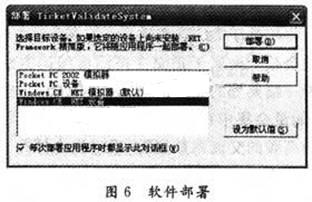 在VisualStudio2003中进行软件设计,并在模拟器中调试成功之后,就可以将软件下载到实验平台中运行,在软件进行部署前安装ActiveSync4.1,并在软件进行部署时选中“WindowsCE.NET、设备”见图6。