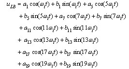 其中,ud表示一个二极管的导通压降,取2.0v,ulb表示桥前线电压,即滤波电容的端电压,uxy表示电网线电压。经过求解方程(1)~(2),得到桥前线电压ulb的表达式(3)和电网电流a相的表达式(4)。