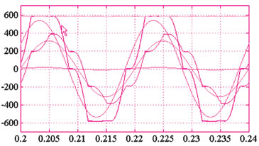 (4)桥前线电压波形与电网相电压几乎同步,呈现交变梯形波,波形平顶大约占120°,波形底部大约占180°,幅值大大提高,其原因是滤波电容通过了并联谐振容性电流和部分谐波电流,前者比重较小,后者比重较大,本例中为几乎全部的谐波电流。在半个周期内,中间60°时间电流近似为零,两端60°时间谐波电流呈指数规律上升,这种谐波电流的分布,通过积分作用,使得桥前线电压呈现这种特殊的波形,其有效值和平均值大大增加,超过电网线电压的有效值和平均值。这种桥前线电压与电网相电压同步,有利于二极管导通角为120°。