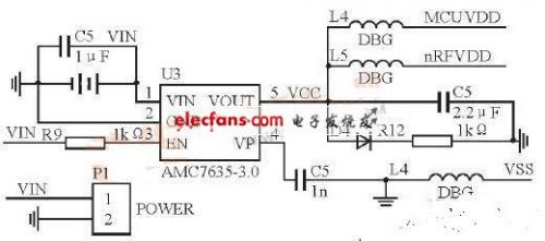 本设计的电源采用3.7V锂电池供电, 然后经低压降电源管理芯片AMC7635,以产生3.0V的电压来为STM32F103和nRF24L01供电, 图1所示是本系统的供电电路。