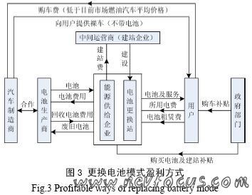 能源供给企业购买电池后通过向中间运营商(建站企业)支付一定的建站费用来进行更换站的建设。电动汽车用户在购买“裸车”后,去电池更换站办理相应的“租赁手续”及交一定的租金就能使电动汽车投入使用。租赁的手续及租金由相关部门协商而定,对于租金可以肯定的是,因为换给消费者的是一块充满电的电池,加上一些其他成本,租赁电池的价格肯定要比消费者自己在家充电贵,但是绝对远远低于燃油的费用。用户在电池的使用过程中不仅要交租金,每次更换电池时根据电池电量的消耗情况用户还要向电池更换站交纳相应的所用电费。