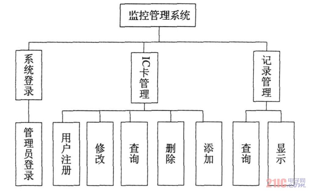 系统基于SQLSERVER2000进行数据库开发,管理员进入系统必须输入帐号和密码,以阻止非系统管理员非法登录系统。之后管理员可完成对卡号信息的注册、查询、修改和删除等工作,并将来访信息(用户和通行时间)记录在数据库中,以便进行数据统计和查询等。监控管理软件的功能模块如图6所示。