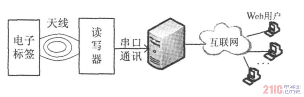系统由电子标签、读写器、串口通讯、服务器和用户终端五部分组成。如图1所示。读写器是系统的核心,其通过射频信号与IC卡(电子标签)通信,完成读卡、存储和发送数据的工作,其可以独立工作,也可联网工作,文中采用RS232串口通信与服务器相连。