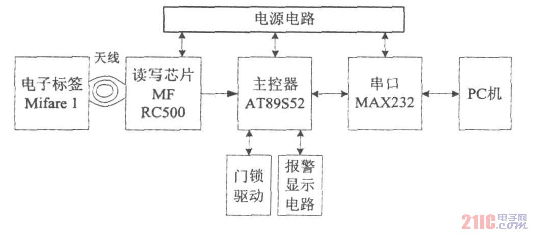 主控器由AT89S52单片机及其外围电路组成,负责控制读写模块、与PC机间的串口通信和对外部设备的控制操作。其中单片机对读写模块的操作就是通过控制MFRC500来实现对Mifare1卡的操作。
