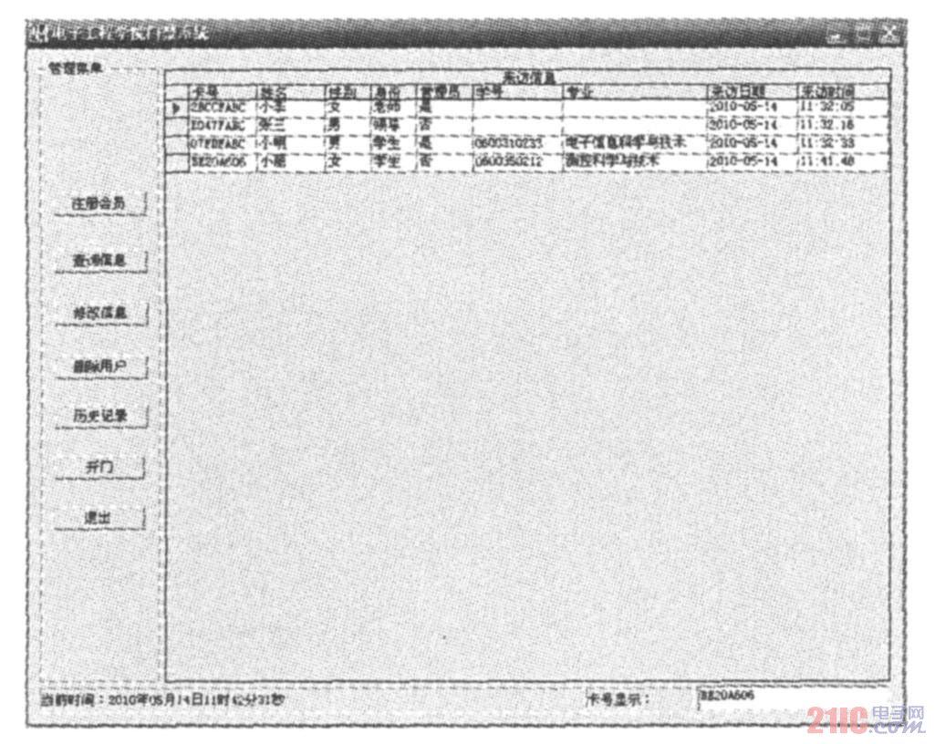 经测试,IC卡有效工作距离为6cm。当IC卡响应时,系统自动显示卡号、持卡用户信息以及进入时间,并自动存入后台数据库。由于Mifare1卡具有全球唯一的序列号,故会员注册时可将会员信息与IC卡序列号捆绑在一起存入数据库。这样查阅信息时可按照时间或直接按照姓名进行精确查找。