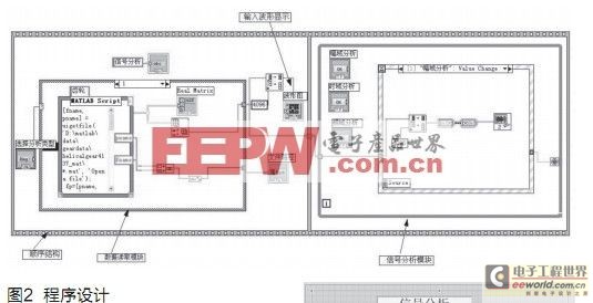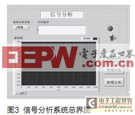 由于读取数据以及后面的数据分析存在明显的先后顺序,因此采用顺序结构将数据读取模块、信号分析模块结合起来,构成统一的总程序。图2示出总程序。左侧框图内实现信号的读取与存储的程序。由于读取的数据类型不同,因此采用选择结构。右侧是程序主体部分,用于实现信号分析及处理,包括幅域分析、时域分析、频域分析。由于信号分析方法的多样性,信号分析模块采用事件结构,通过调用子程序的办法来实现。信号分析系统总界面见图3。