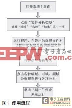 笔者开发的信号分析系统主要分为三大模块,即文件管理模块(文件的读取及存储)、信号分析模块、显示模块。按照图1所示的使用流程对这三个模块进行设计。