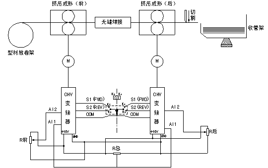整个过程由前级挤压成型、高温无缝焊接、后级挤压成型、切割。在整个控制过程中,需要电机输出比较大转矩,同时,速度的稳定精度高,否则,挤压成型的钢管结构不均匀,厚薄不稳定,影响产品品质。