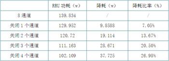 在某些话务量极低的时段,当所有业务时隙均关闭之后,可通过关闭射频通道达到降低能耗。根据分析,以大唐移动多通道RRU在南京现网中的实测数据为例(见表三),此时关闭四个通道可使整个RRU节电37w左右,降耗比率达到27%。