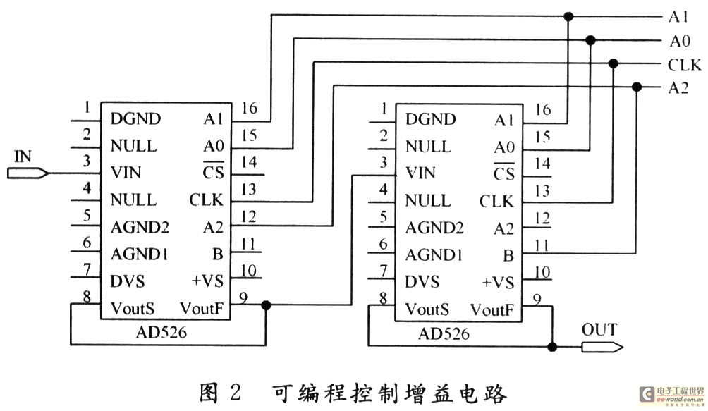 在本系统中,利用两片AD526和单片机AT—mega32设计了能够进行自动增益控制的放大器。AD526是美国AD公司生产的一款性能优良的软件可编程放大器,单片AD526的放大倍数是1,2,4,8和16,两片AD526级联后可获得32,64,128和256倍增益。由于输入模拟信号幅度大小的差异,有可能要求使用不同的放大倍数进行放大,以满足线性放大要求,则放大器的放大倍数需要实时控制,AD526能够满足这样的要求,它的放大倍数随时可以由一组数码控制。将从CD4501输入的现场信号根据要求自动调整到适合A/D转换的最佳输入范围,再启动AD574进行转换,能够有效地保证在低输入时的转换精度,扩大采集系统的动态范围。可编程控制增益电路如图2所示。