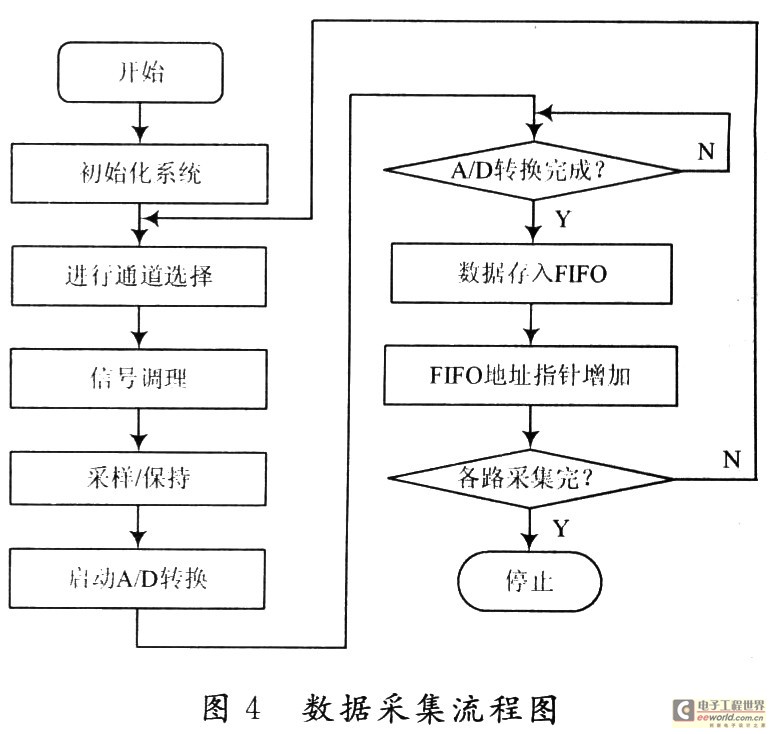数据采集系统的软件设计使用C语言编写,程序分成若干个功能相对独立的模块,包括主程序、增益控制、数据采集、USB通信等子模块,对各个子程序分别进行单独设计与调试,最后将调试好的各子程序块链接起来进行总体调试。数据采集程序设计的流程图如图4所示。