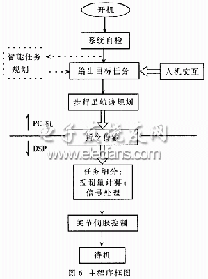 在本文设计的机器蟹控制器中,采用分时集中方式和多CPU的结构。步行足控制器采用分时集中方式,由一个CPU对3条步行足的9个关节进行控制,CPU可对各关节的反馈控制策略进行协调控制,完全由软件确立各关节之间的耦合关系。而整个机器蟹的全局控制器结构为多CPU结构,由3个步行足控制器(即3个CPU控制单元)并联成伺服控制层,并由一个中央控制CPU协调控制。机器蟹步行足控制系统的单关节控制过程如图6所示。由PC机(上位机)将每一个动作任务分解为各关节转角,并每隔一个插补时间T1执行一次上下位机指令,将下一个T1时间内各指关节的目标转角指令值发送给DSP控制器(下位机)。DSP控制器将插补时间内的转角按可控精度进行周期为T2的插补细分,细分后所得任务为各个关节电机控制中断程序的实际目标指令,并在插补周期时间内实现电机转角位置伺服控制,从而完成步行足的运动控制。除此之外,控制系统软件还包括步行足轨迹规划运算、系统自检和初始化、故障判断、程序终止、力/位置信号采集处理等功能模块。