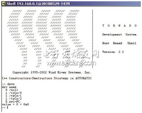 系统上电之后,bootrom首先运行,然后通过网线将VxWorks映像文件下载进rom中,图3所示为VxWorks的Shell界面,显示设备列表有串口和网口,表明串口和网口驱动成功。
